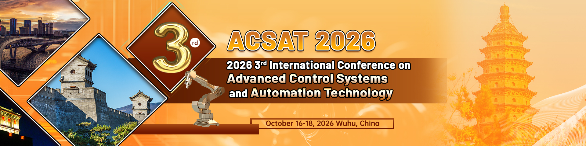 2026 3rd International Conference on Advanced Control Systems and Automation Technology (ACSAT 2026) will be held on October 16-18, 2026 in Wuhu, China. The conference centering on the latest research fields of "Advanced control" and "Automation". It provides an international platform for experts, professors, scholars and engineers from domestic and foreign universities, research institutes, enterprises and institutions to share their professional experiences, expand their professional networks, exchange new ideas face-to-face, and present their research results, to discuss the key challenges and research directions of the development of this field, with a view to promoting the development and application of the theories and technologies of this field in universities and enterprises, as well as to establish business or research contacts for the attendees, and to find global partners for their future endeavors.